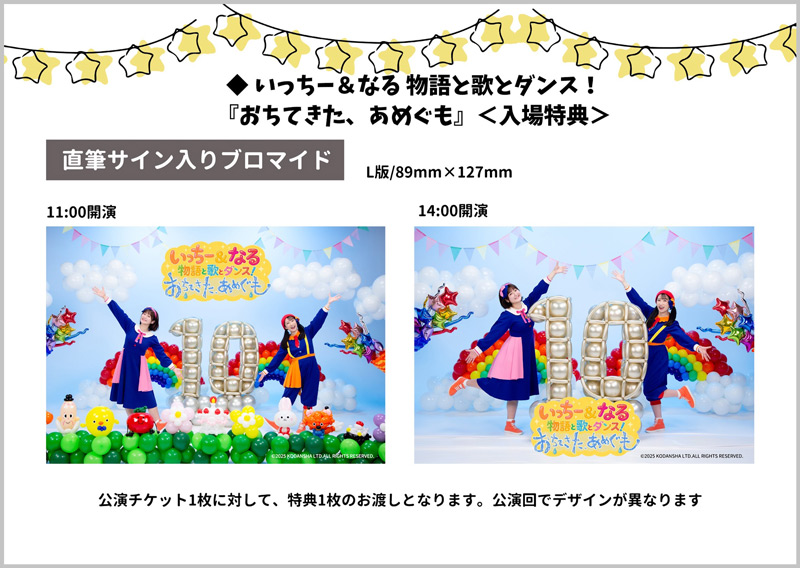 入場特典は、ここでしか手に入らない本公演仕様の「いっちー&なる」のサイン入りブロマイドです。特別感あふれるこの機会をお見逃しなく!