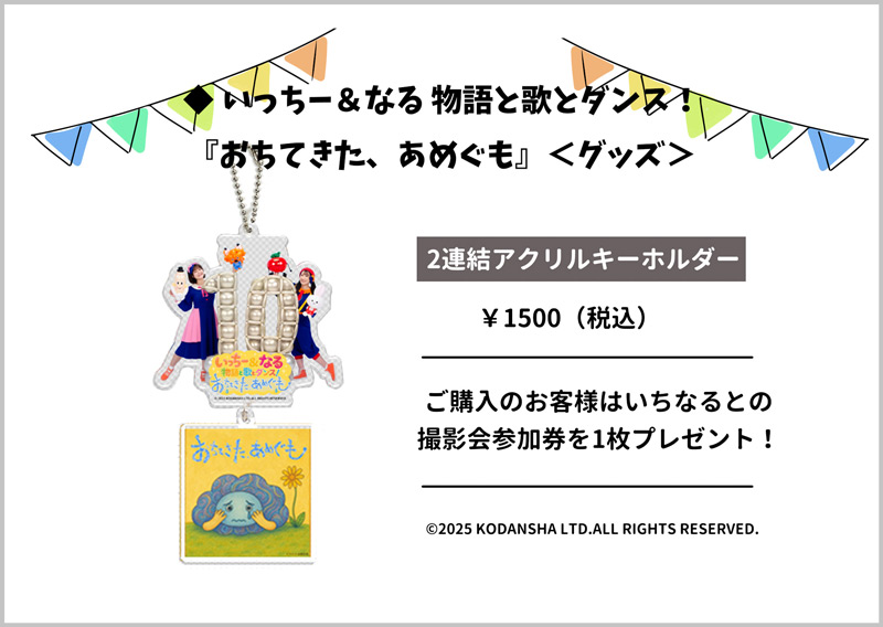 また本公演のグッズも公開!「いっちー&なる」とあめぐものイラストが連なったアクリルキーホルダーの販売が決定しました。ご購入の方を対象に、終演後にいっちー&なるとの撮影会にご参加いただけます。是非会場でお買い求めください。